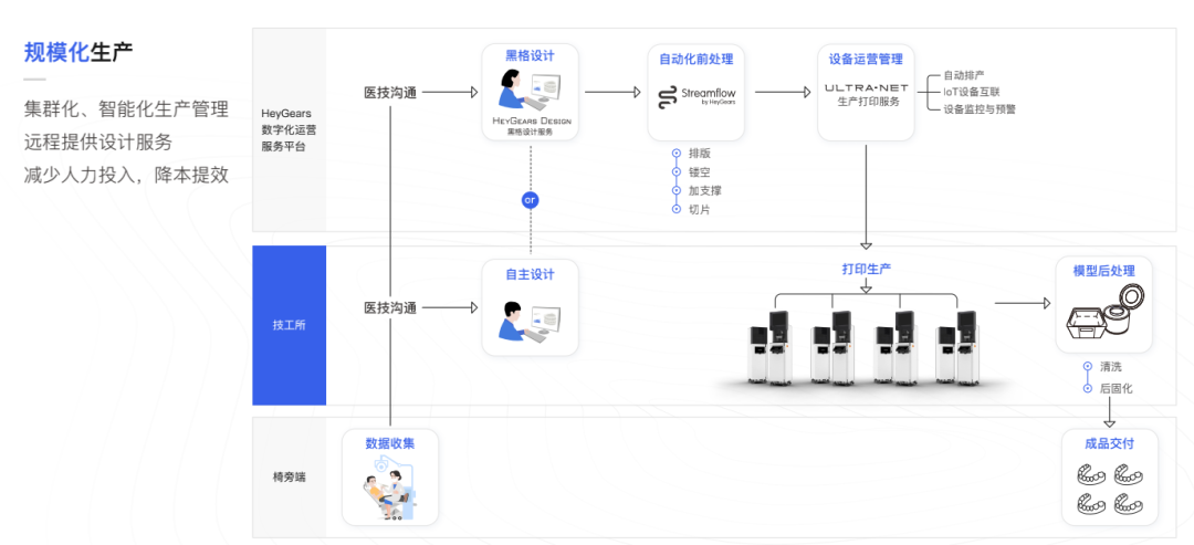 基于行业标准化难题,黑格科技打造了基于SaaS服务的3D打印+垂直应用领域的数字化运营服务平台——HeyGears Cloud(黑格云),以此充当齿科加工环节的“流程大脑”,从数据传输、产品设计到生产打印的每一个环节,全面提高自动化程度,真正实现无人值守化生产。