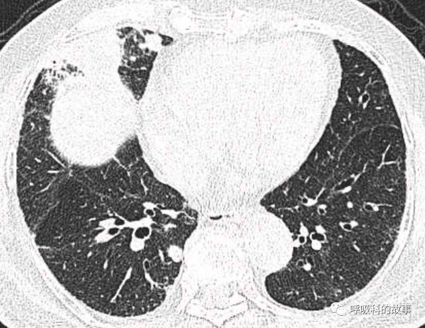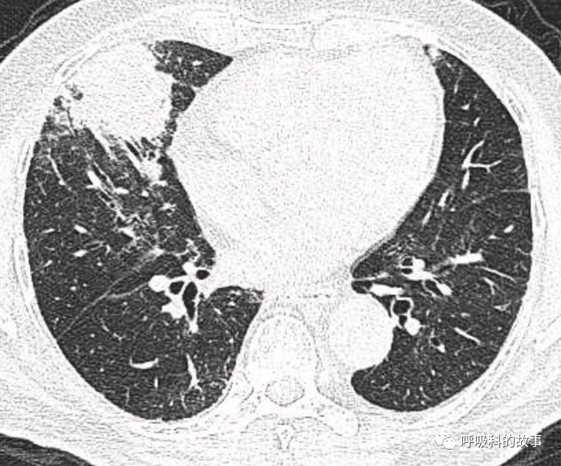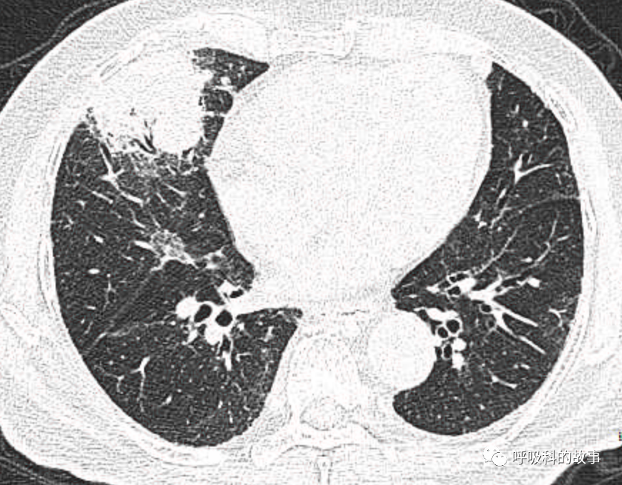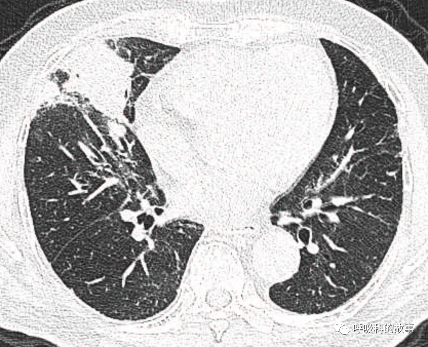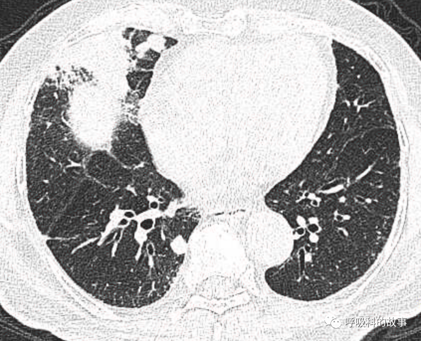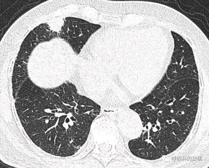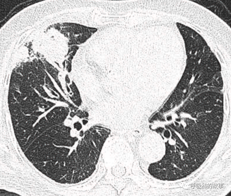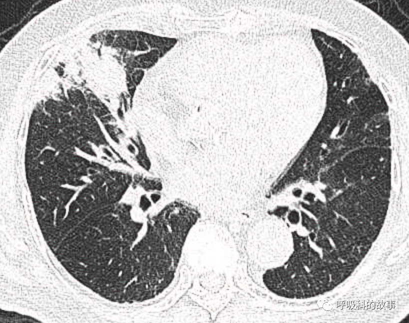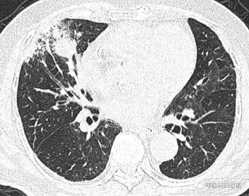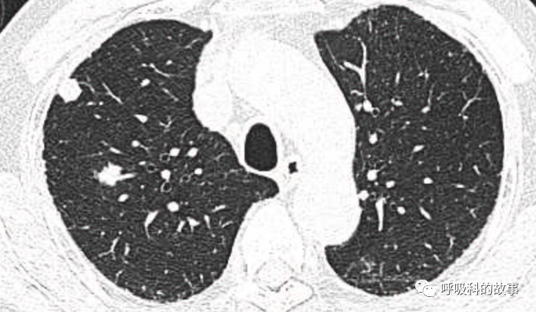 可是就在今年初,患者曾住在某院某科室,因为其他内科疾病住院。当时肺部CT也发现了在右中叶内侧段的高密度实变影,由于影像很类似肺炎,因此当成肺炎治疗。