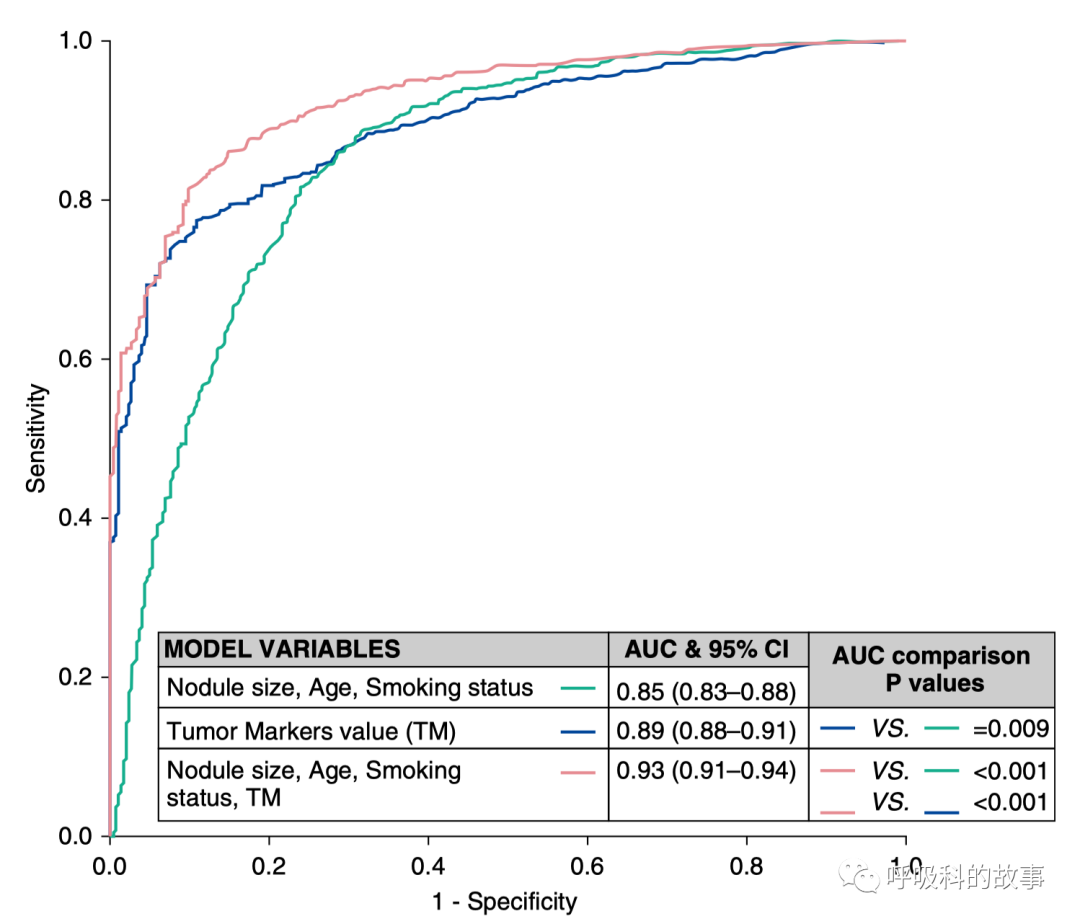 文中提到,通过我们详细询问病史结合影像分析结节或肿块特点来判断肺部肿块良恶性的准确性和单纯依靠肿瘤标志物的准确性程度相当,曲线下面积分别是0.85 vs 0.89。肿瘤标志物甚至略胜一筹。