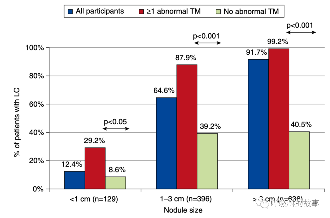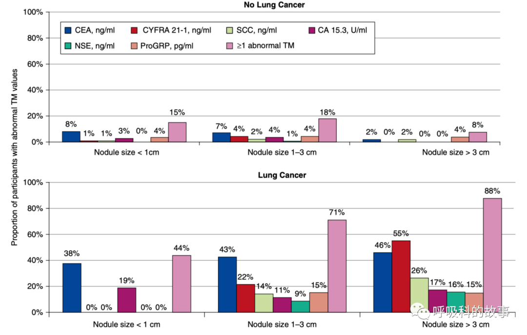 图18 具有按结节大小分层的异常肿瘤标志物值的参与者(有和没有肺癌)的比例