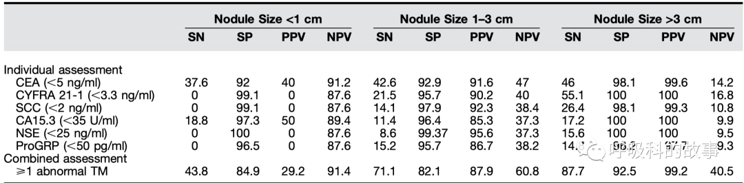 注:每个单独 TM 及其组合评估(≥1 个异常 TM)的敏感性、特异性、阳性预测值(PPV)和阴性预测值(NPV),按结节大小分层