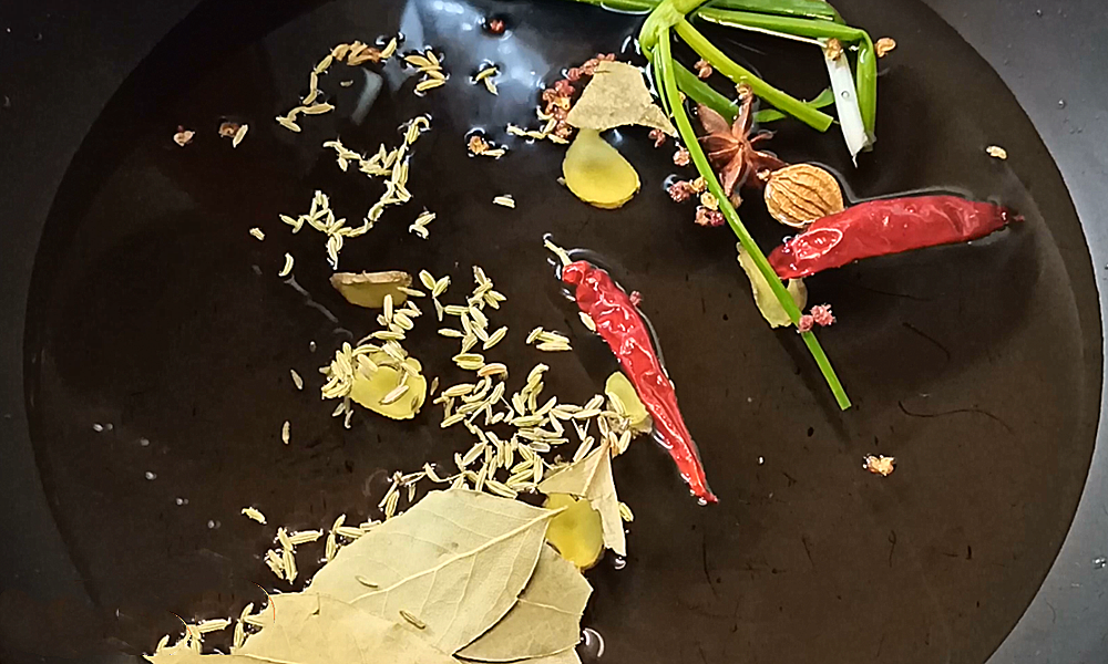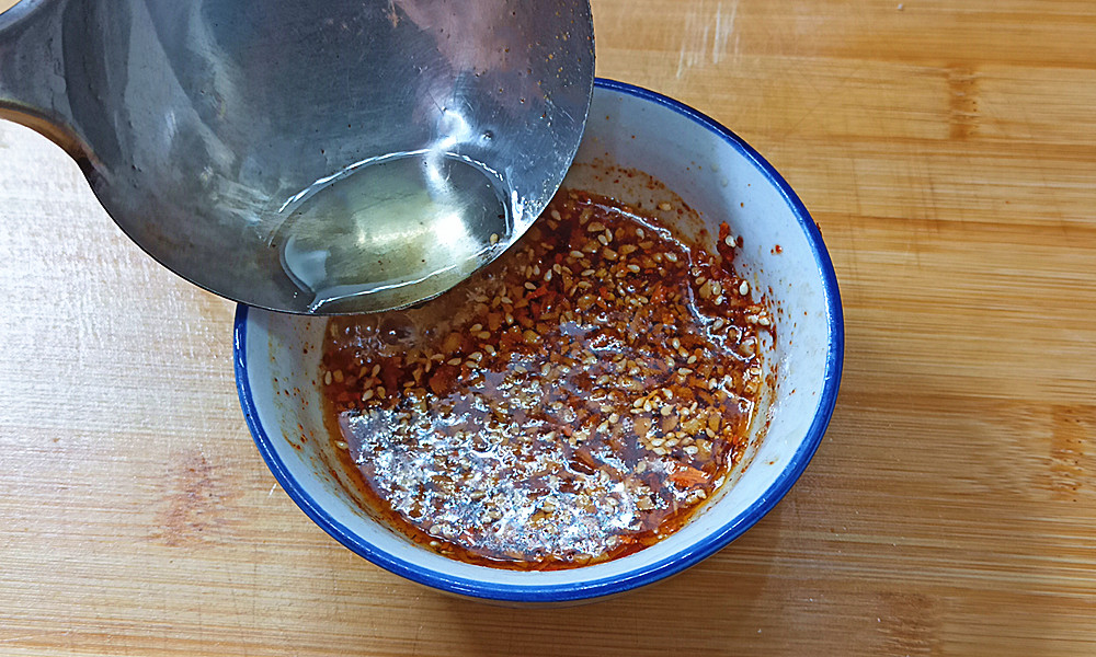 【步骤六】:锅中放油烧至冒烟,然后浇入调料碗中,分两次把调料的香味激发出来。