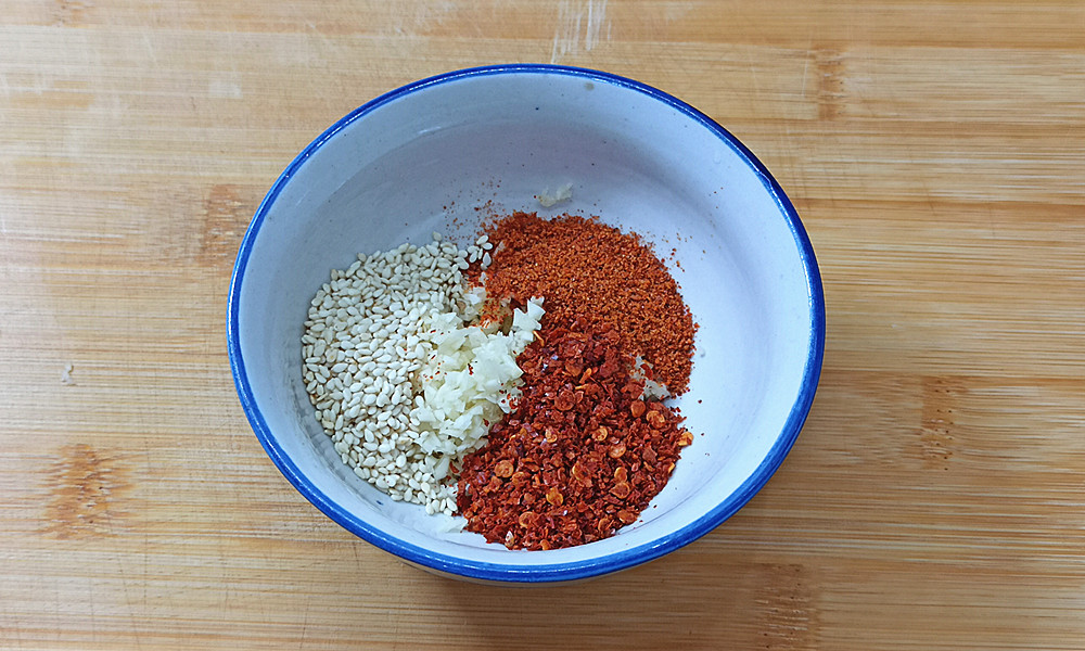 【步骤五】:大蒜拍碎剁成蒜末放入碗中,再放入一勺细辣椒面和一勺粗辣椒面、一勺白芝麻。