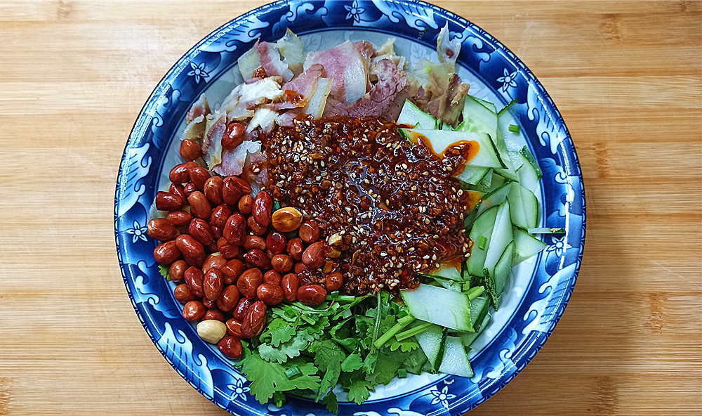 【制 作 主 料】:牛头肉1斤、黄瓜1根、熟花生米1把