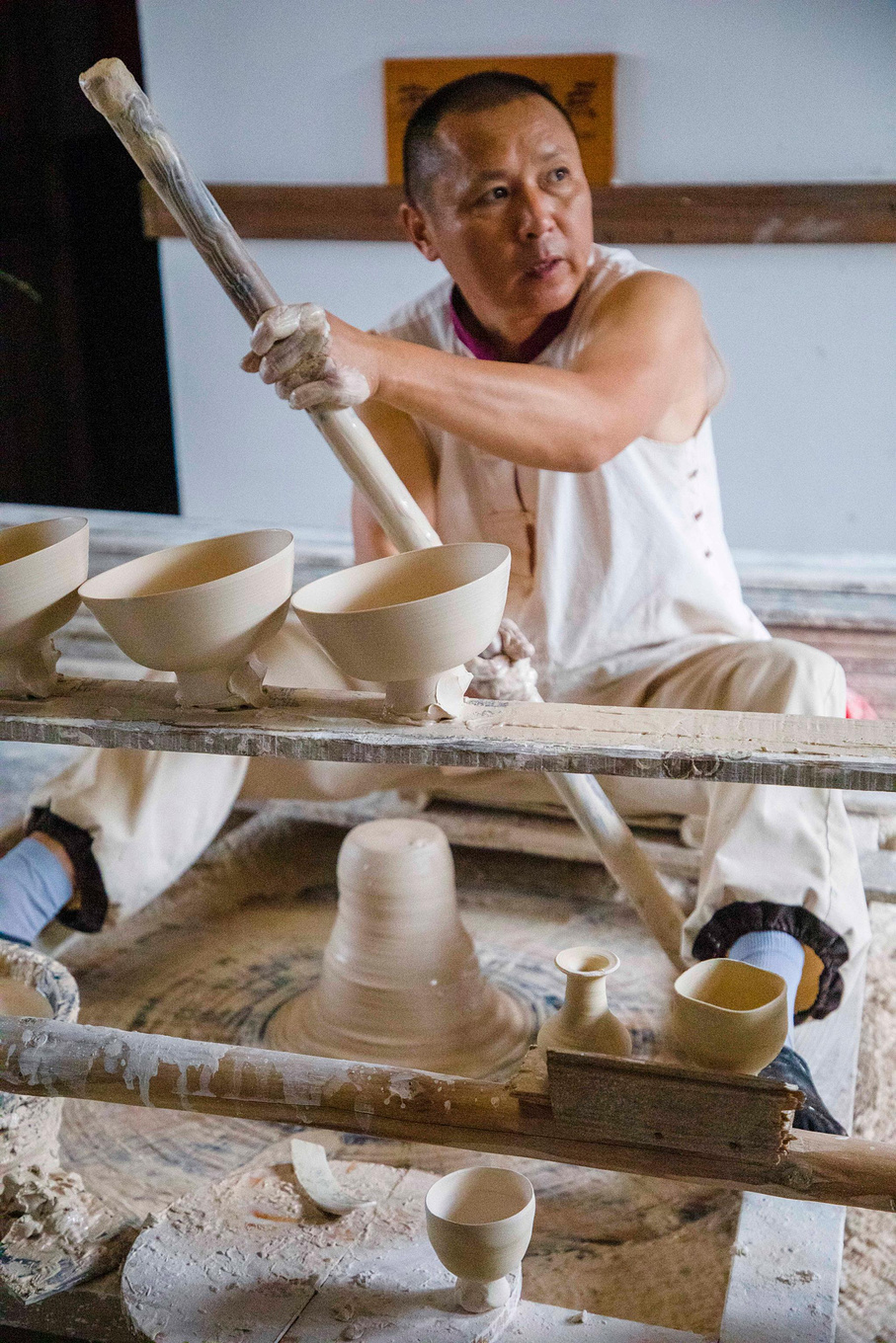 手工拉胚是一种传承性手工艺技艺,看似简单的操作实际非常复杂,力道的掌握必须要非常精准,纯手工拉胚制作陶瓷是传统手工艺的精髓。在作坊里可见到“手随泥走,泥随手变”,看似不经意的动作,却可以被经验丰富的师傅,用巧夺天工的技艺拉坯成型