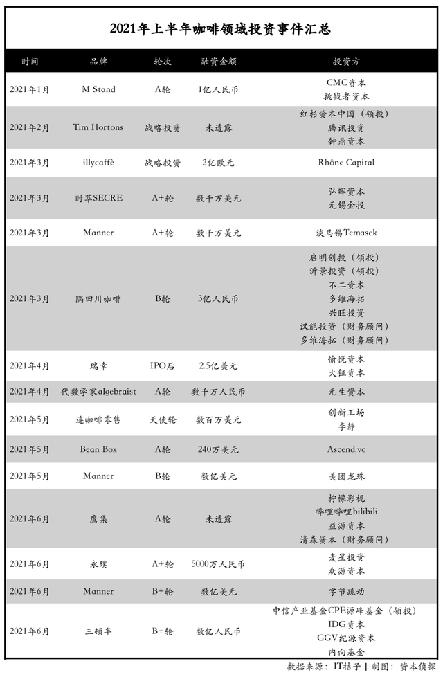 据IT桔子数据统计,今年上半年咖啡领域相关项目融资事件共有15起,从走入绝境又重获新生的瑞幸,到速溶这一细分赛道上的“网红”三顿半、永璞和时萃,走高端精品路线的Manner和M Stand……过亿元的融资屡见不鲜,资本市场的目光更是遍布咖啡所有细分品类。