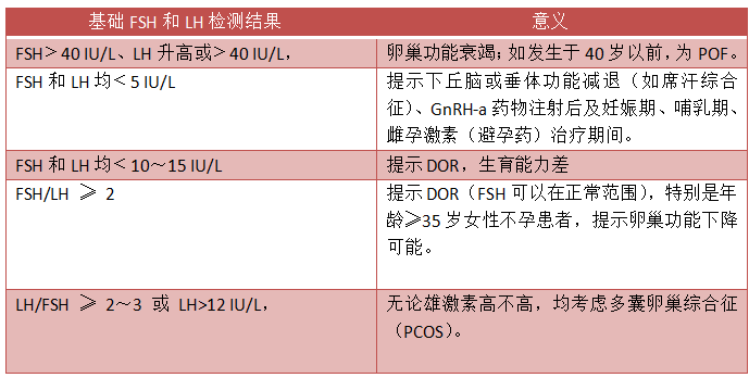 基础E2&45-80pg/ml(165.2-293.6pmol/L),无论年龄与FSH如何,均提示生育力下降。基础E2≥100pg/ml(367pmol/L)时,卵巢反应更差,即使FSH<15IU/L,也基本无妊娠可能。E2&80pg/ml,均考虑卵巢反应不良、功能下降,建议联合AMH检查及阴道超声综合判断。