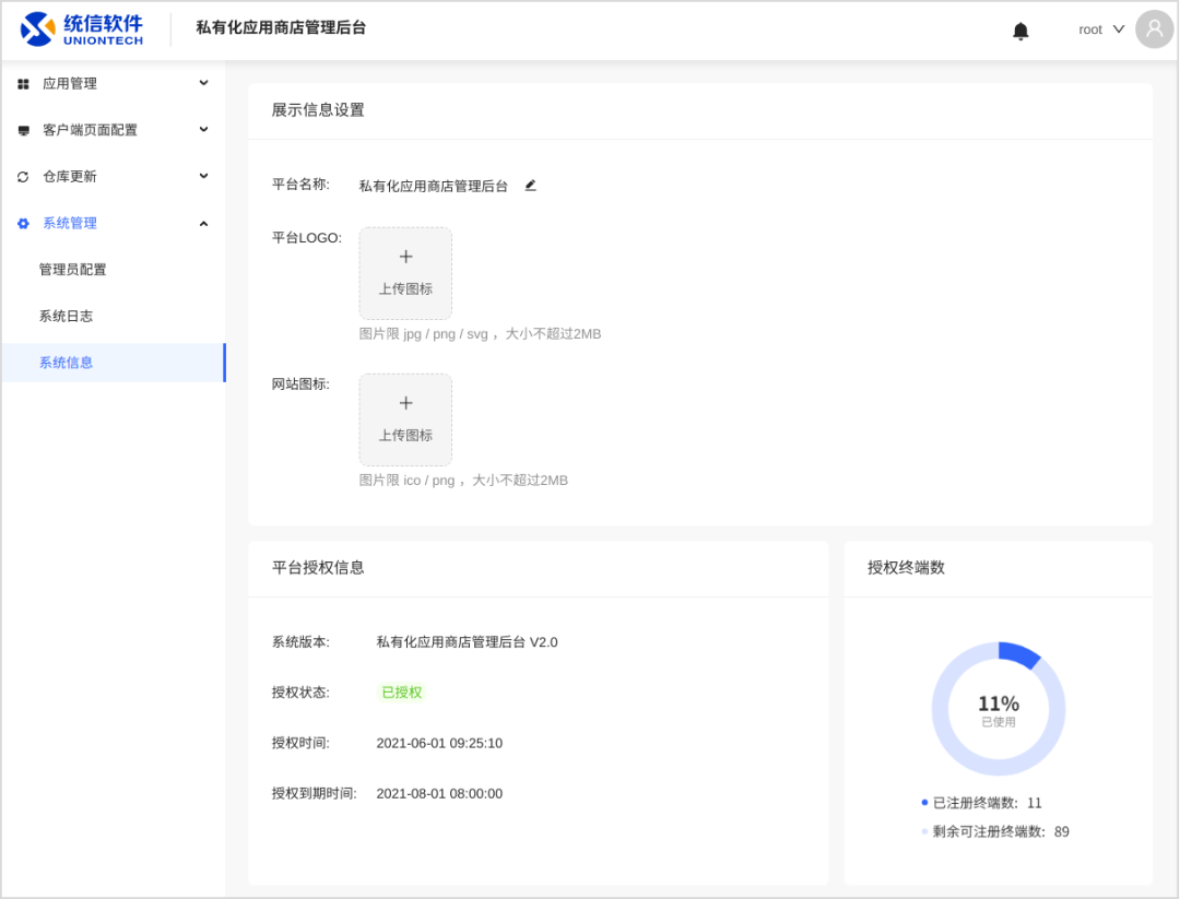 新增管理后台信息展示和图标自定义:可以自定义后台展示的名称和 LOGO;显示后台当前授权信息,含授权状态、授权时间、授权终端信息。