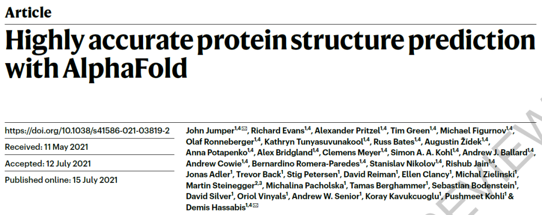时隔一年半之后,2021年7月15日,DeepMind的Demis Hassabis、John Jumper等人在Nature杂志上发表了文章Highly accurate protein structure prediction with AlphaFold,描述了AlphaFold2(作者强调AlphaFold2与CASP13中的AlphaFold是完全不一样的模型。“a completely different model from our CASP13 AlphaFold system”),这是一个基于神经网络的新模型,其预测的蛋白质结构能达到原子水平的准确度。