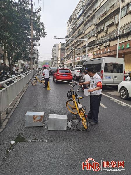 映象网讯(记者 邱延波 通讯员 陈喜中 文/图)6月27日早上,郑州市优胜南路与卫生路交叉口附近,一变压器疑遭车辆撞击后变形,造成变压器漏油。随后,电力人员赶到现场抢险,预计附近居民用电会短时间受到影响。