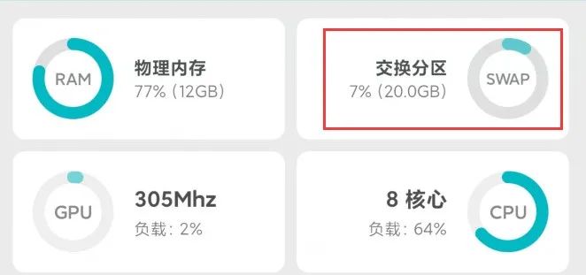 在打开一波应用后,我们发现,即使手机物理内存占用高达近 80% ,交换分区的虚拟内存依旧处于较低的占用。