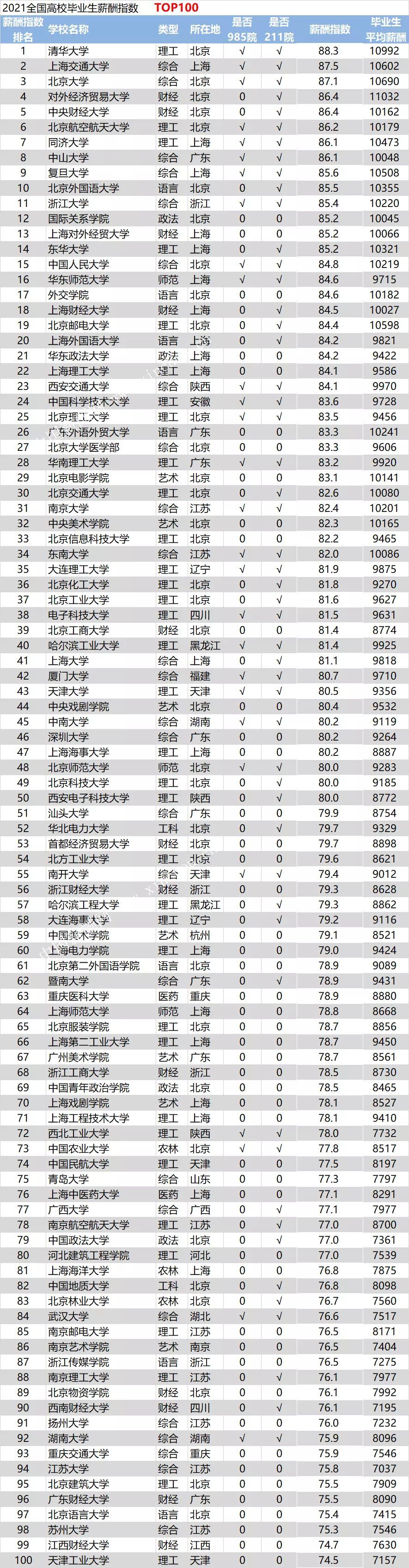 近日,中国薪酬指数研究机构发布的《2021全国高校毕业生薪酬指数排行榜》显示,清华大学、上海交通大学、北京大学、对外经济贸易大学、中央财经大学、北京航空航天大学、同济大学、中山大学、复旦大学及北京外国语大学位列前十,其中985高校7所、211高校10所。