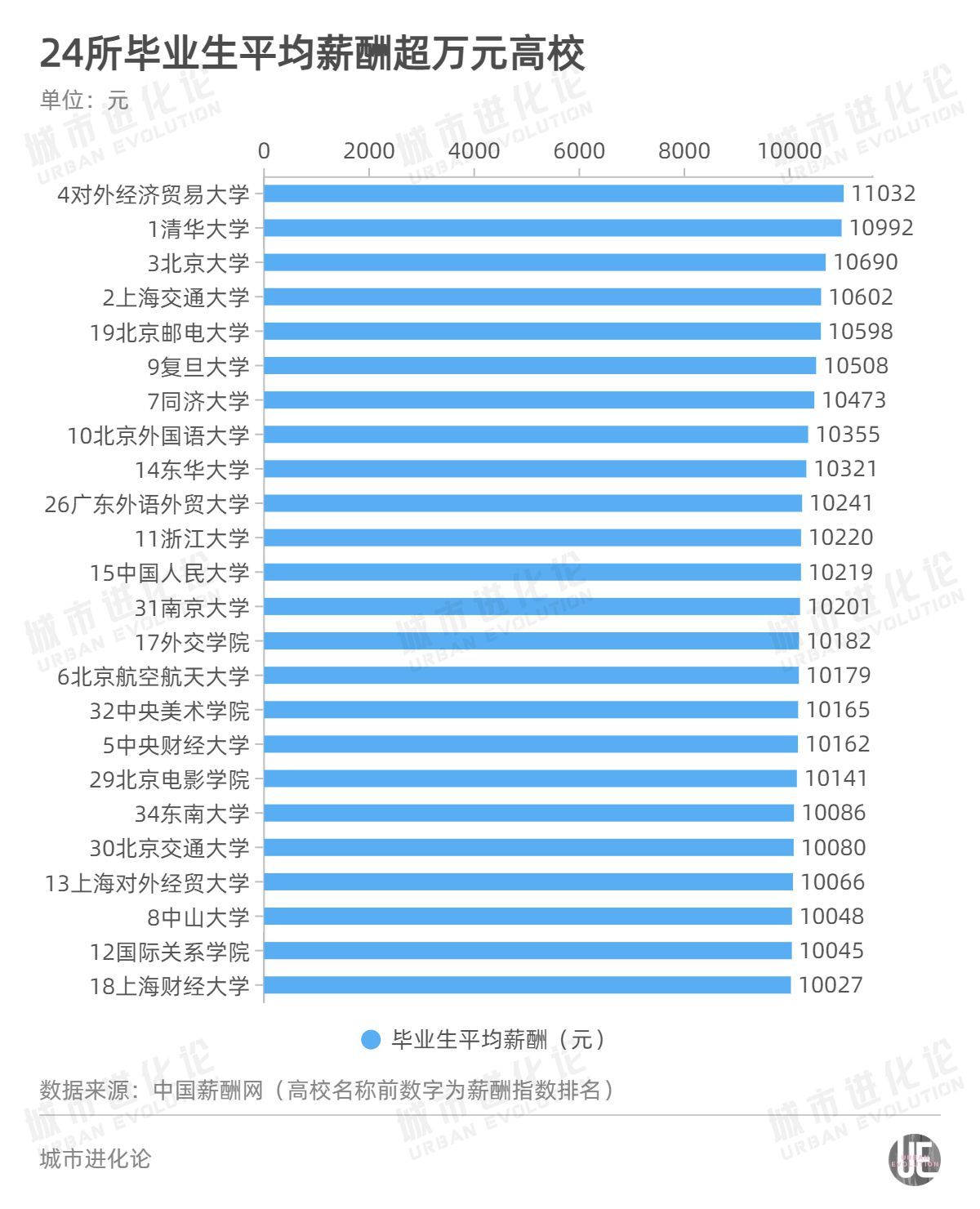值得注意的是,尽管对外经济贸易大学薪酬指数排名第四,但毕业生平均薪酬全国最高,达到11032元,也是唯一一所超过11000元的高校。上海交通大学薪酬指数虽然超过北京大学排名第二,但平均薪酬不及北京大学。