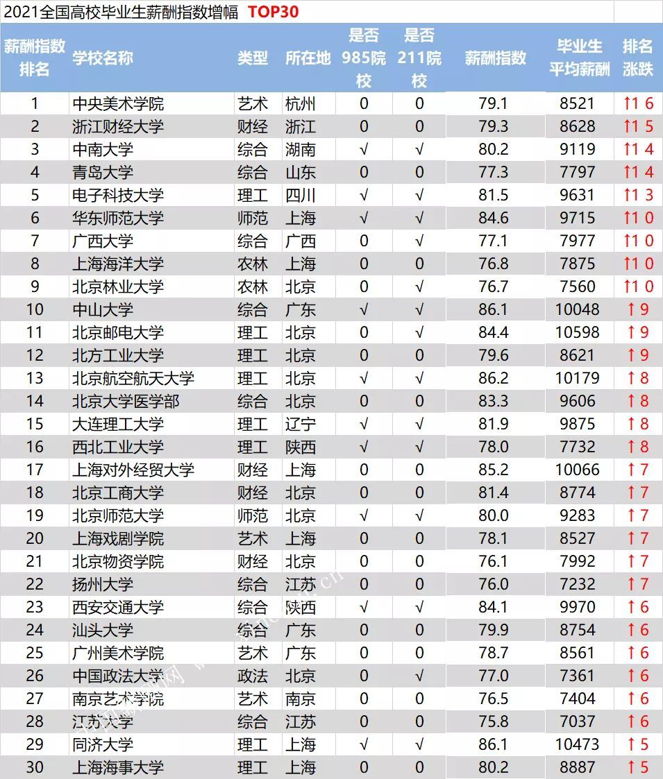 百强榜中,中央美术学院排名上升最快,2020年排名第47名,今年排名第32名;浙江财经大学去年排名第70名,今年上升15位;中南大学由去年第58上升至第45名。其他一些排名显著上升的高校,因专业设置符合当前经济环境和行业需求,毕业生工资水平、就业率、人才成长率、薪酬增长率相对增幅均较为明显。