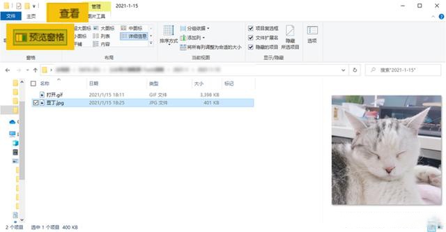 点击“查看”,选择“预览窗格”,然后点击一下文件(图片、Word、Excel、PPT等),就能在窗口右侧预览文件内容了。