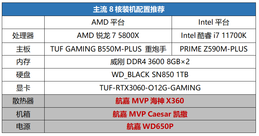 其实,航嘉旗下除了电源产品之外,还有机箱和散热器产品线,可以说为玩家提供了机电散热一站式装机解决方案。因此,在我们的推荐配置中,我们选用航嘉WD650P搭配航嘉MVP海神X360散热器(支持多平台的高性价比360一体式水冷散热器)、航嘉MVP Caesar凯撒机箱(超宽体10槽旗舰机箱),这套组合完全可以满足主流玩家对于散热、供电、高端硬件兼容性的装机需求,值得大家在装机的时候优先考虑。