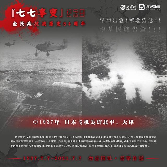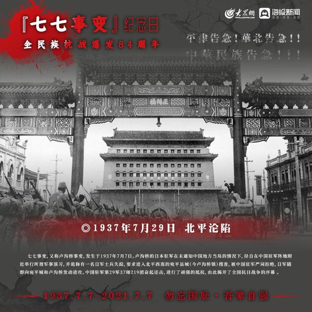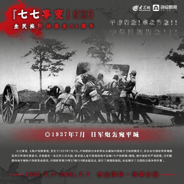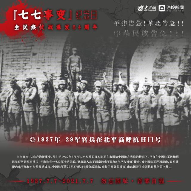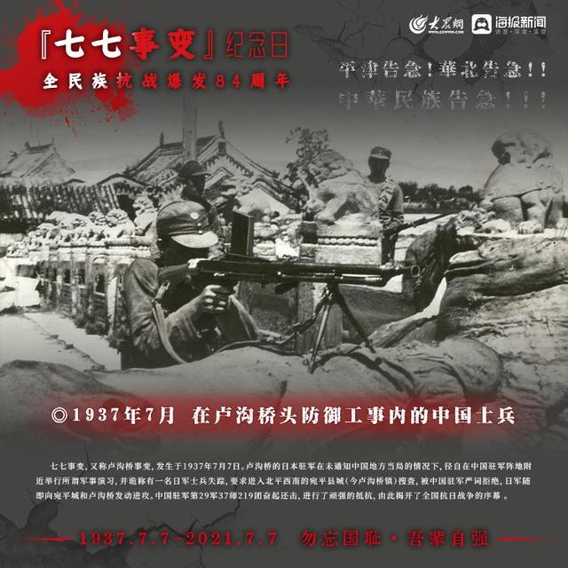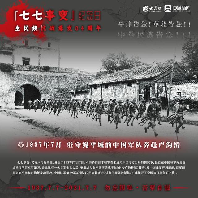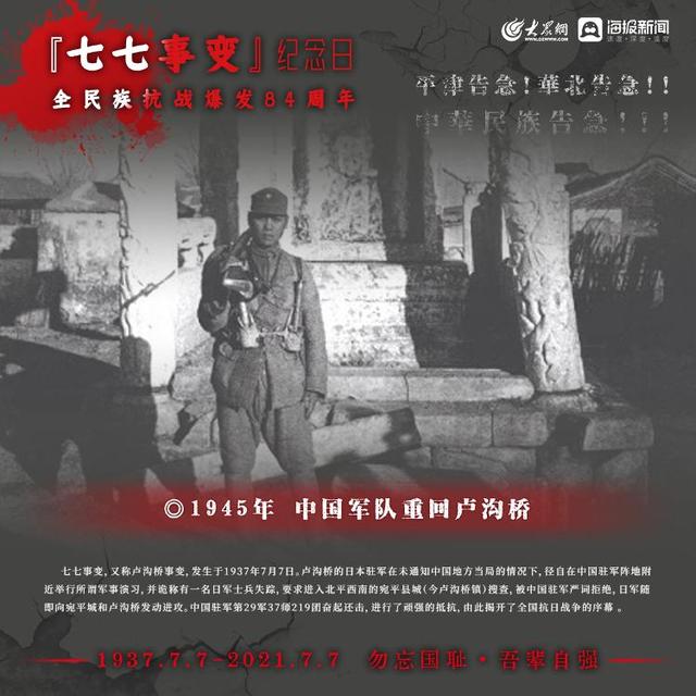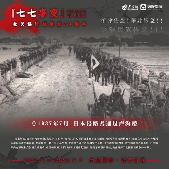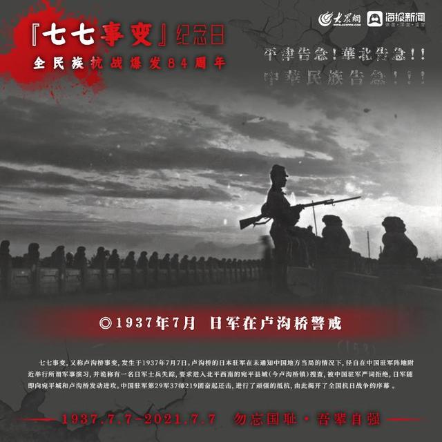 1937年7月7日,日本侵略军发动卢沟桥事变(七七事变)中国的全民族抗战拉开序幕如今,84年过去了那段历史,那段岁月依然铭记在心,永不敢忘!今日山河日新,吾辈自强!大众网·海报新闻策划:聂冬梅编辑:刘亚制图:宋一鸣