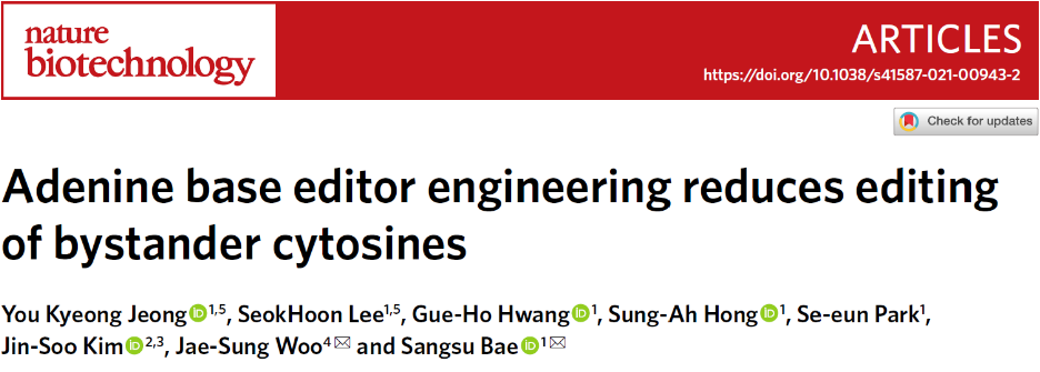 2021年7月1日,来自韩国汉阳大学化学系的Sangsu Bae实验室与首尔大学的Jae-Sung Woo实验室合作在Nature Biotechnology杂志上发表了题为Adenine base editor engineering reduces editing of bystander cytosines的论文。文章通过对腺苷脱氨酶TadA进行点突变筛选,实现了对ABE系统的改造与优化。文章指出,TadA中的D108Q点突变可大幅降低ABE系统编辑胞嘧啶(C)的能力,从而提升了ABE的安全性。更重要的是,研究者还发现,TadA中的P48R突变可以让ABE变身高特异性的CBE工具,能特异性的编辑TC序列中的胞嘧啶(C),实现TC-TT或TC-TG的转变。