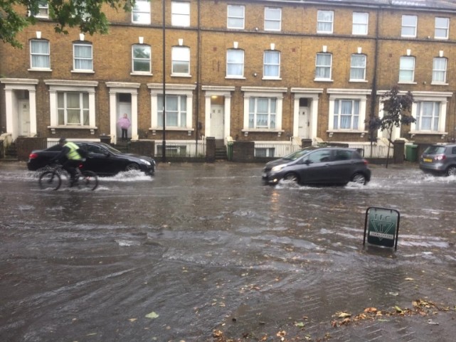 根据大伦敦政府的数据,伦敦有17%的地区面临着高级或中级的洪水风险,超过100万伦敦人生活在洪泛区。伦敦已经在泰晤士河上建造了一个巨大的防洪系统,以保护该市免受潮汐洪水的侵袭,但这些防洪屏障在应对突发暴雨引起的内涝时起不到什么作用。而由于气温上升,暴雨正变得越来越常见。