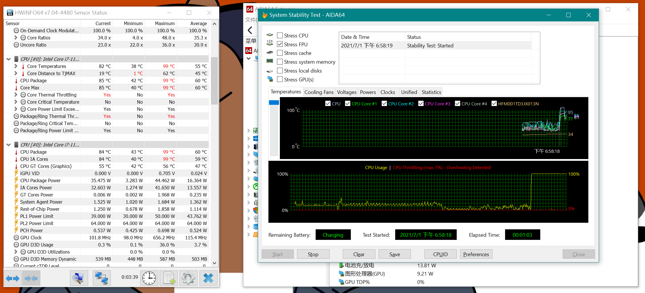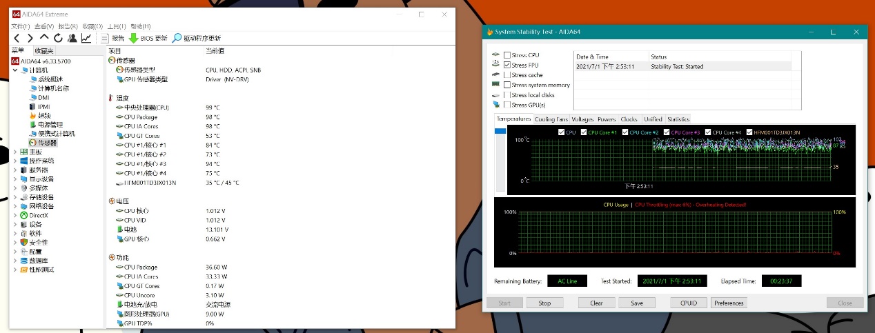 小米笔记本Pro X 15在CPU拷机开始的一瞬间,CPU核心温度可以瞬间达到100℃左右,此时CPU摸到50W左右的峰值功耗。运行一小段时间之后CPU会开始逐渐降低工作功率,直到处理器核心温度不超过96℃。至于降多少功率那就取决于环境温度,如果它所在的环境温度没那么理想,CPU功率甚至会降到30W以下。
