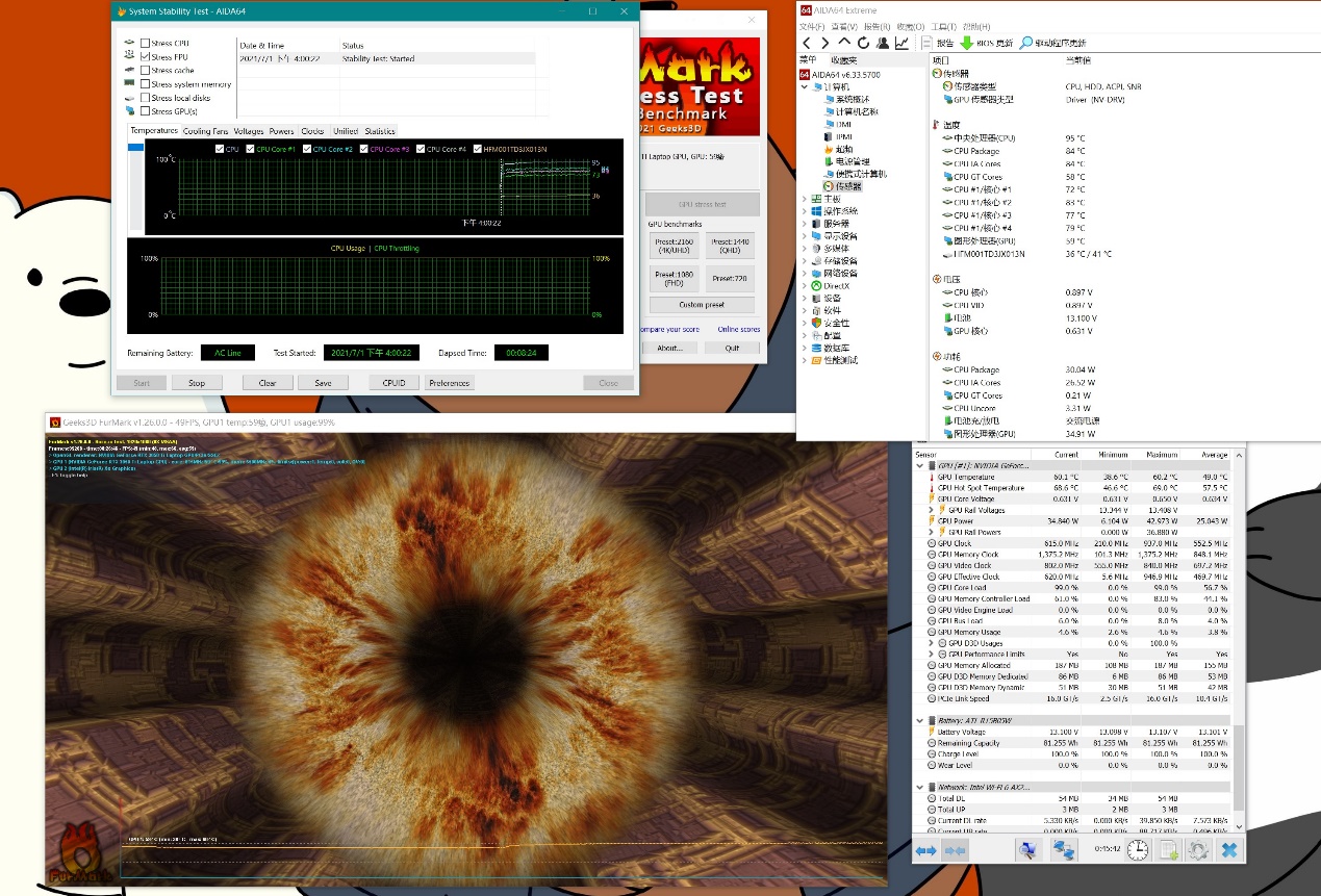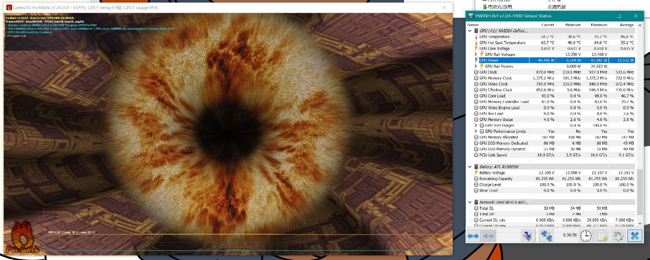 在进行GPU单拷之后,我更加无法理解小米设定40W的做法。因为小米笔记本Pro X 15的散热系统完全有能力去压制更高功率的独显,不说和游戏本一样干倒95W,但在这个模具内部跑个65W上下完全没有问题(毕竟GPU单拷温度才57℃)。我思索半天唯一合理的解释,就是小米为了避免全金属机身的发热问题。