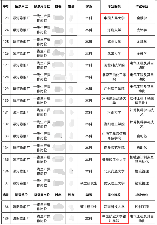 剩余的135人,均被河南中烟下辖7家卷烟厂的“一线生产操作岗位”拟录用。