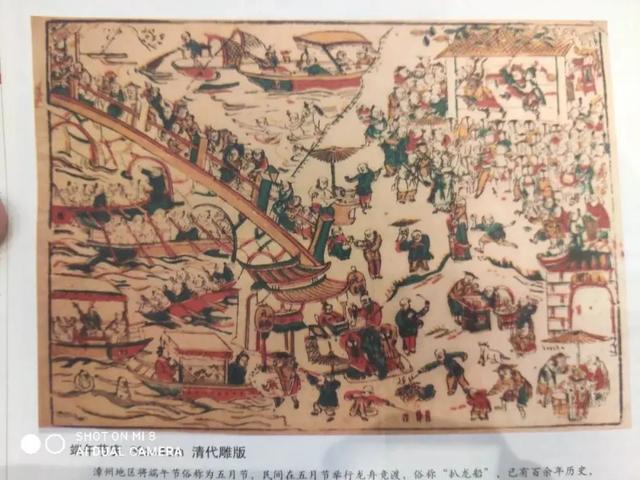 上图为《端午节庆》,收于“漳州非物质文化遗产丛书”《漳州木版年画》专辑中。如画可见,九龙江中,一场划龙舟比赛如火如荼进行着;岸上,摊贩摆摊,以美食助兴,生动描绘出清末民众生活习俗画面。