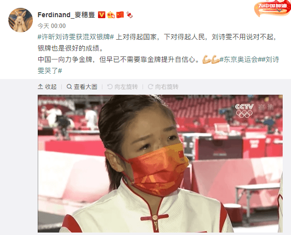 对于这一点,国内体育记者麦穗丰认为不需要如此。“上对得起国家,下对得起人民,刘诗雯不用说对不起,银牌也是很好的成绩。”麦穗丰写道。