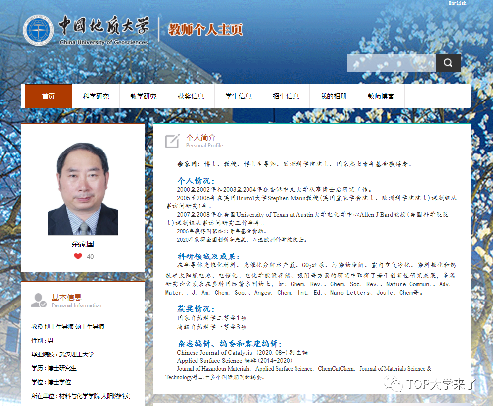 TOP前言“TOP大学来了”小编从中国地质大学(武汉)了解到,欧洲科学院院士余家国已于6月加盟该校,并携团队组建太阳燃料实验室。
