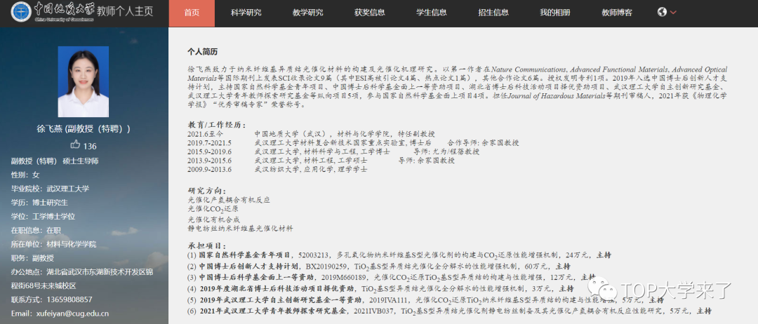 徐飞燕,中国地质大学材料与化学学院副教授(特聘) 硕士生导师。致力于纳米纤维基异质结光催化材料的构建及光催化机理研究。以第一作者在Nature Communications, Advanced Functional Materials, Advanced Optical Materials等国际期刊上发表SCI收录论文9篇(其中ESI高被引论文4篇、热点论文1篇),其他合作论文6篇。授权发明专利1项。2019年入选中国博士后创新人才支持计划,主持国家自然科学基金青年项目、中国博士后科学基金面上一等资助项目、湖北省博士后科技活动项目择优资助项目、武汉理工大学自主创新研究基金、武汉理工大学青年教师探索研究基金等纵向项目5项,参与国家自然科学基金面上项目4项。担任Journal of Hazardous Materials等期刊审稿人,2021年获《物理化学学报》“优秀审稿专家”荣誉称号。