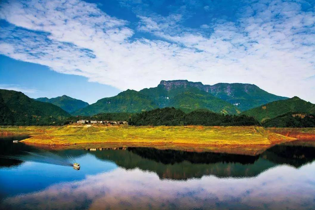 青山叠翠,熏风养肺,翩翩水鸟啼声脆。牧笛吹,彩云飞,奇峰倒影丹青绘,汀上沙鸥岩上溪。舟,行画里;人,游画里。
