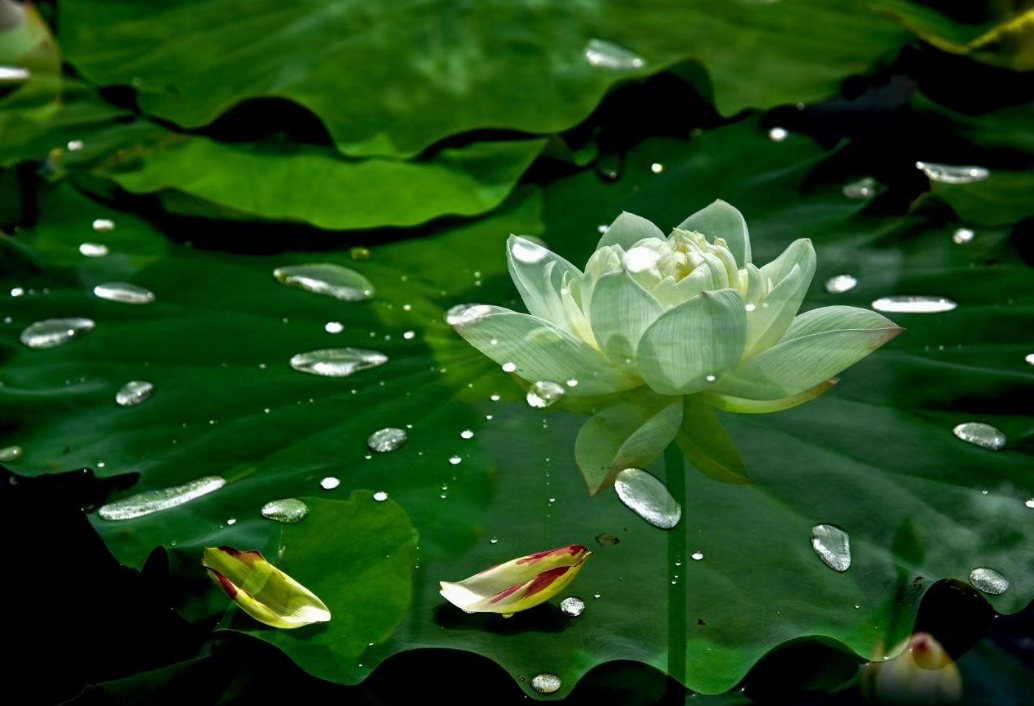 碧叶涵光向晚天。碎珠敲梦响清圆。影摇波动可人怜。 零露未消乡国忆,幽香自续佛家缘。宵来恰对月初弦。