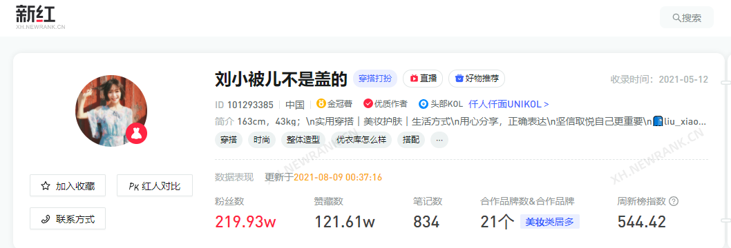 欢迎来到新榜红人录栏目,不定期更新,关注快速涨粉的小红书账号,报道小红书上有料有趣的博主故事。本期采访对象,是在小红书上发过834条笔记、拥有220万粉丝的头部穿搭博主“刘小被儿不是盖的”,一个能把平平无奇的基础款穿出彩来的女生。ps. 更多小红书热门数据,欢迎移步新榜全新推出的小红书全场景AI数据平台“新红”围观:https://xh.newrank.cn/