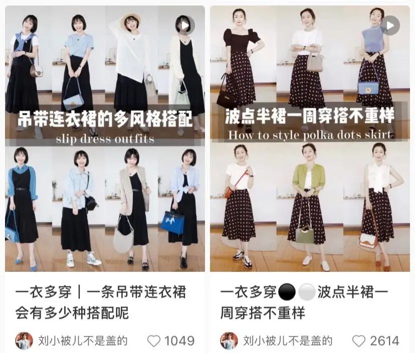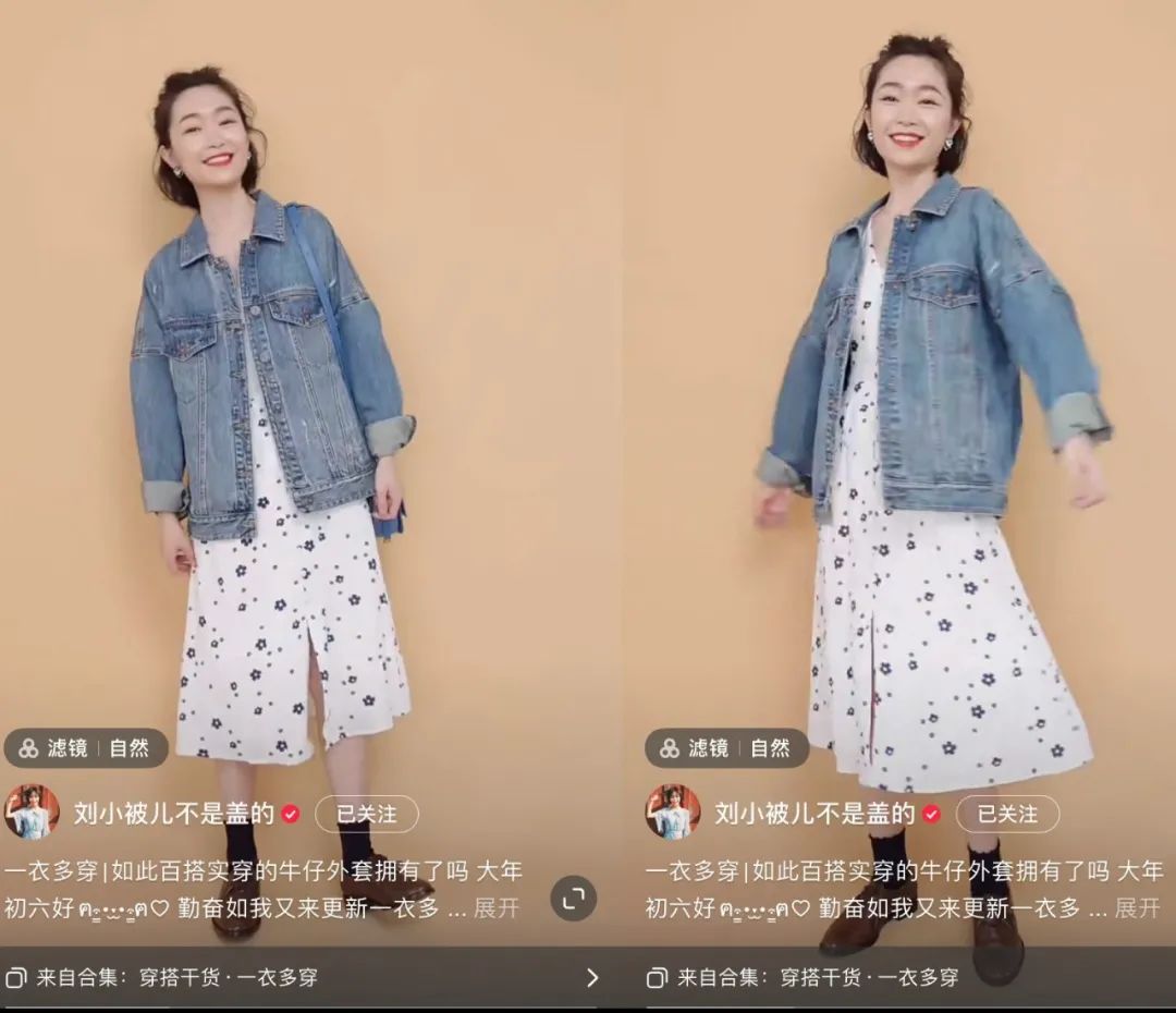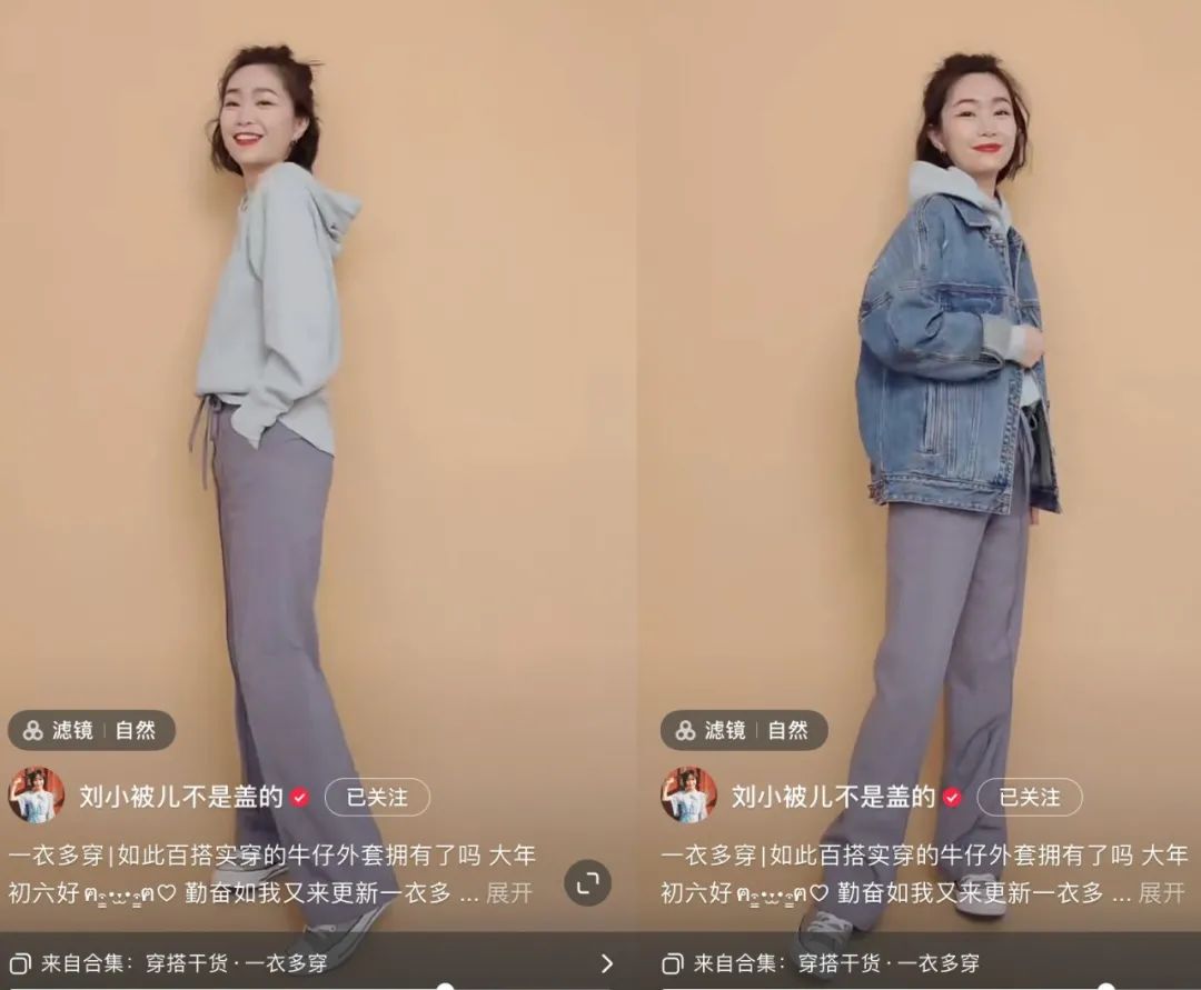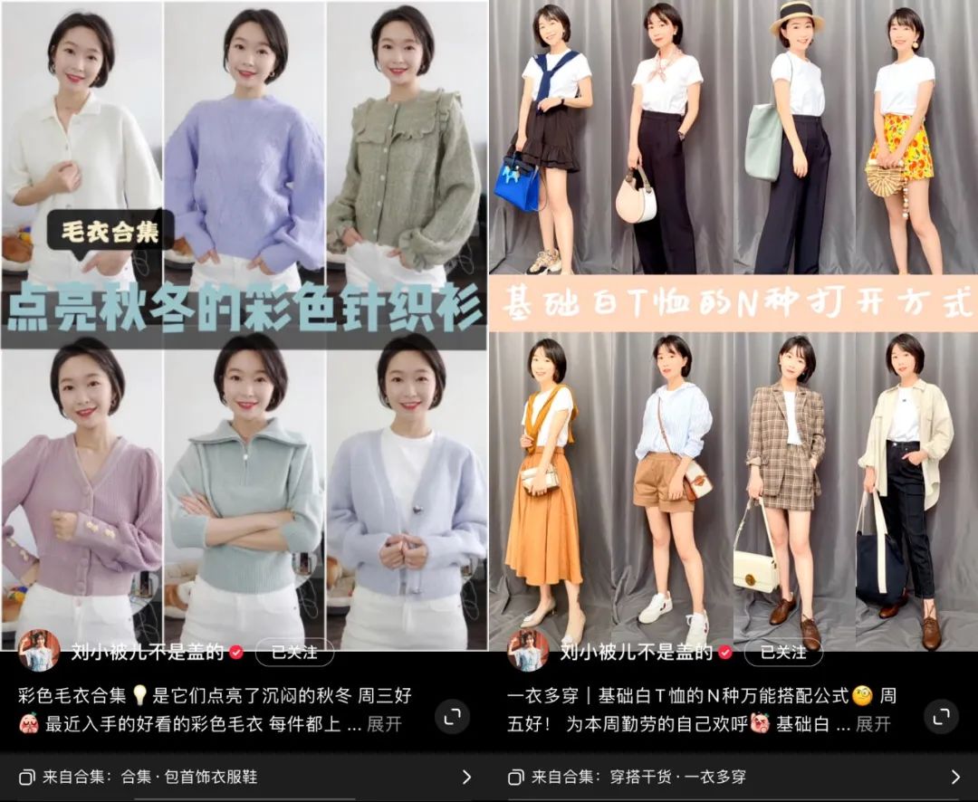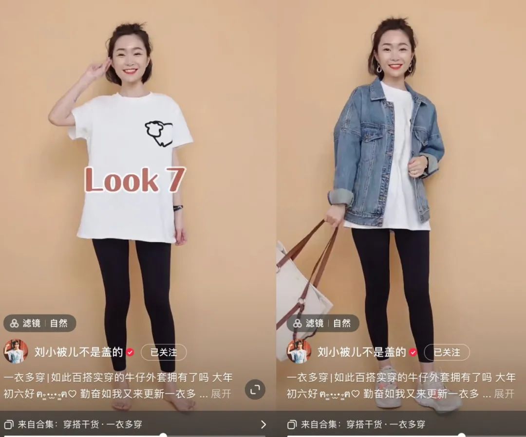 从早期的“每日穿搭”图片,到后来的“胶囊衣橱”“一衣多穿”“一条裤子/裙子/外套的X种穿法”等穿搭视频,刘小被把一件单品穿出了不同的风格。