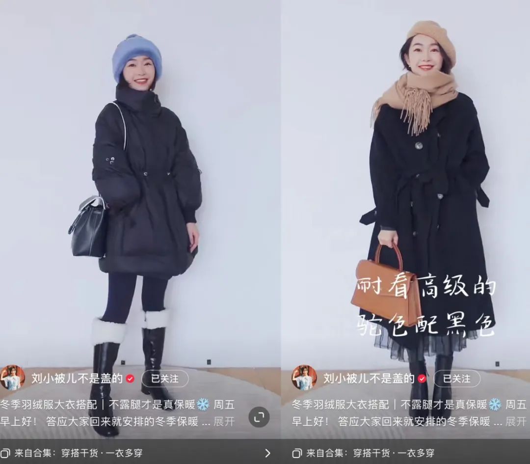 发布于去年12月的视频“冬季羽绒服大衣搭配,不露腿才是真保暖”中,刘小被展示了6套保暖又好看的冬季羽绒服大衣搭配,这条视频给她的小红书账号带来了5.9万点赞,3.7万收藏和2500+条评论。