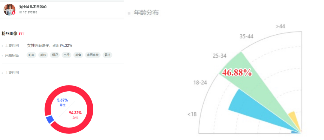 左:粉丝性别分布 右:粉丝年龄分布(小红书账号“刘小被儿不是盖的”)