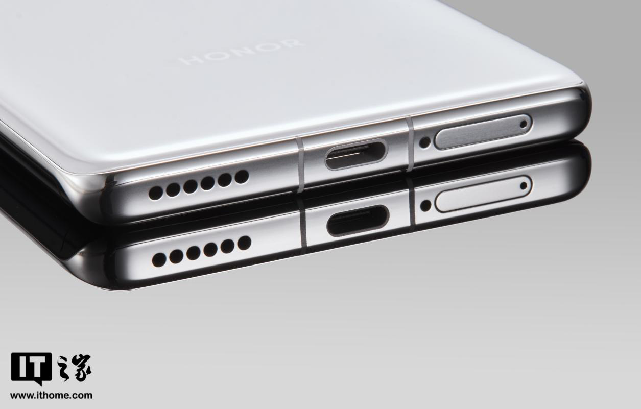 在机身顶部,荣耀 Magic3 采用了微缝听筒设计,不仔细看还真难以发觉,这种设计既保证了实用性,也尽可能保留了机身完整性。顶部中框区域则放置了扬声器、麦克风,以及红外传感器,顶部中央区域略有下凹的设计,使得看上去更有层次。