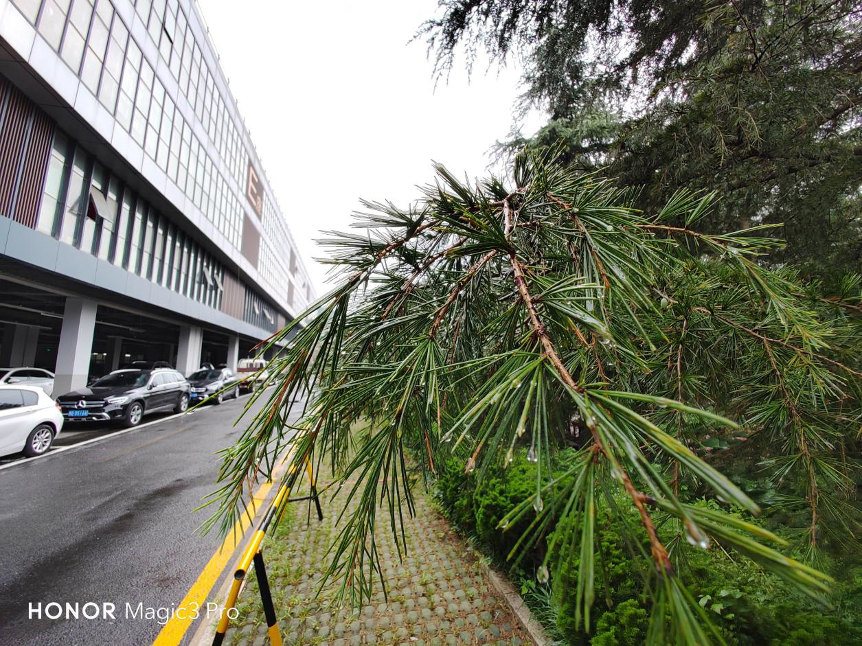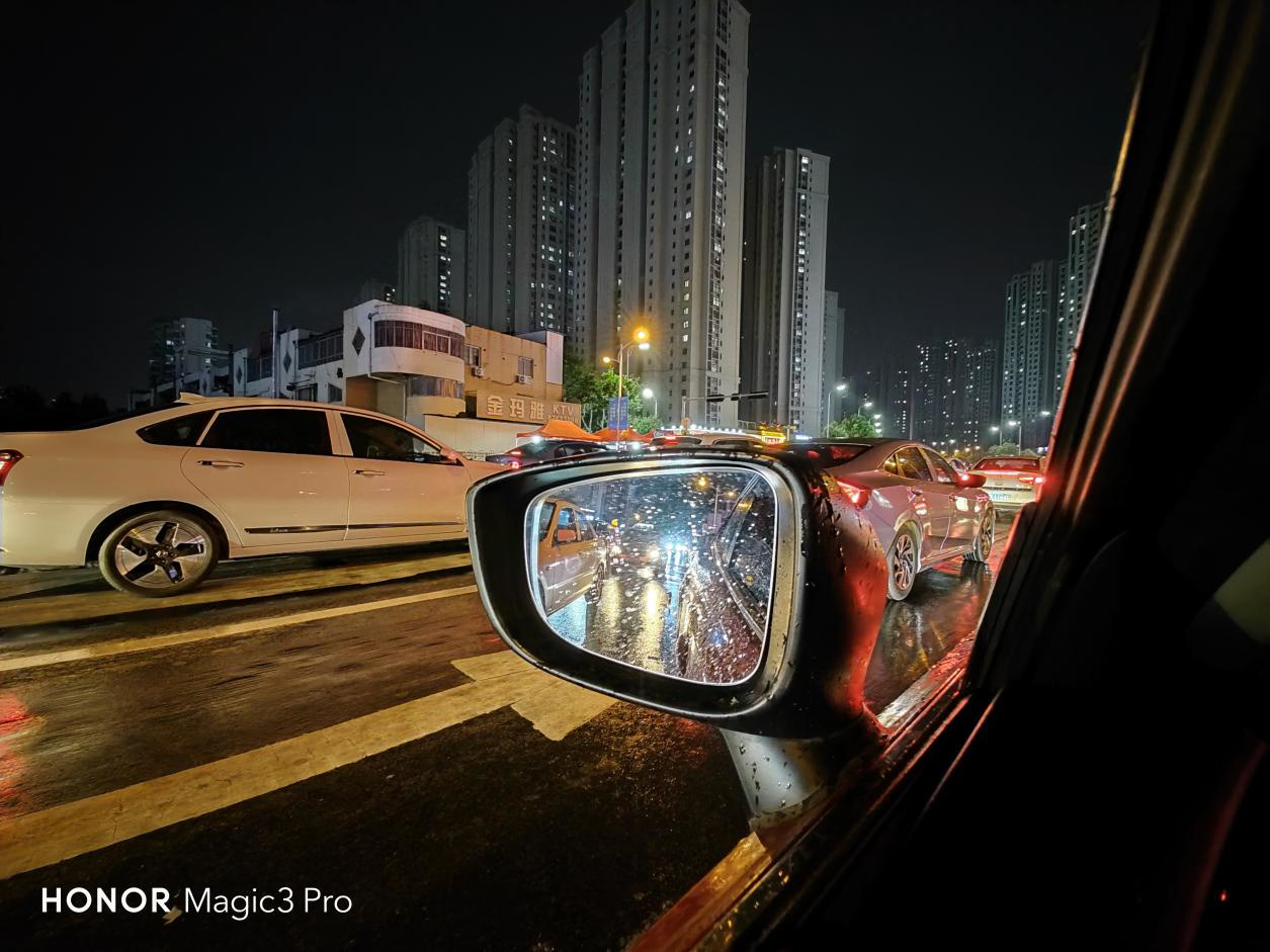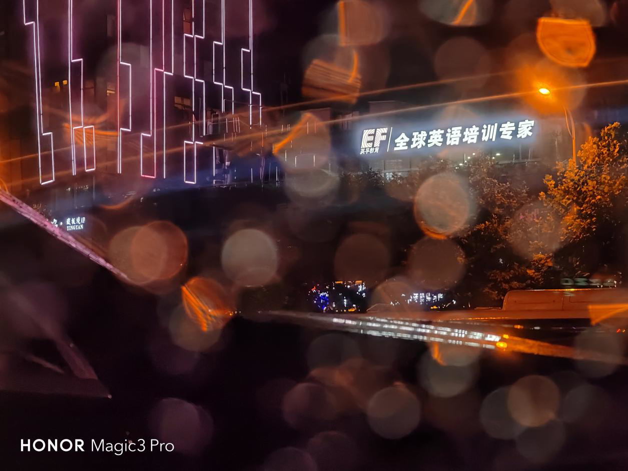 在夜景样张中,荣耀 Magic3 Pro 有着不俗的曝光和色彩表现,整体亮度比人眼所见要高一个档位,但又没有无脑的拉升曝光也提升画面亮度,对高光的控制也非常出色。雨天夜晚远处的路灯、车灯乃至路边的广告牌,都能很好地压住高光,保证了照片的自然和生动。