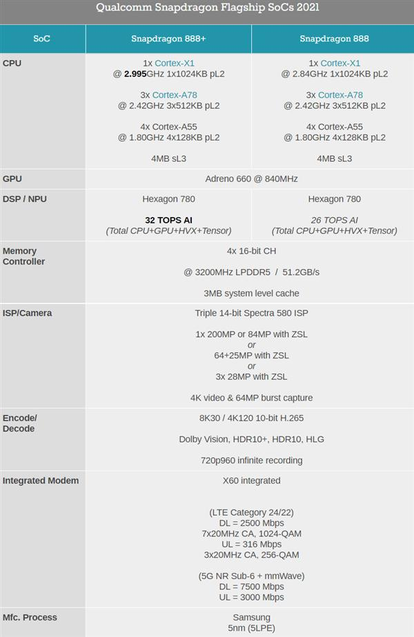 与骁龙 888 相比,骁龙 888 Plus 最大的变化在 AI 和超大核的提升上,其中超级内核主频提升至 3.0GHz,相比骁龙 888 提升了 5.6%;此外,其支持的第 6 代高通 AI 引擎的算力达每秒 32 万亿次运算(32 TOPS),AI 性能提升超过 20%。