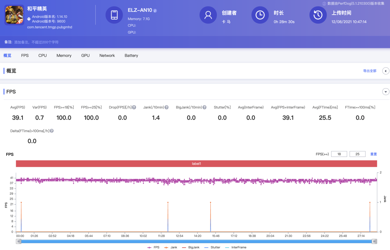 《和平精英》,同样是最高画质(超高清 + 40fps),30 分钟的游戏,平均帧率为 39.1fps,游戏过程中基本全程稳定,没遇到任何肉眼可见的掉帧现象。