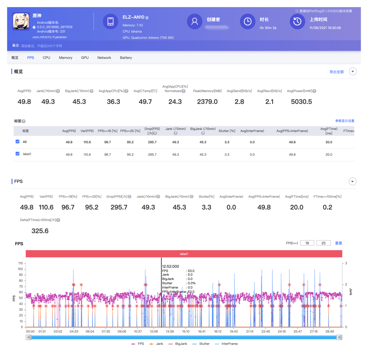 首先是最高画质的《原神》,开启性能模式,所有特效全开,60fps 画质下游戏 30 分钟,平均帧率为 49.8fps,妥妥的旗舰机表现水准。耗电方面,100% 亮度、30 分钟的游戏共耗电 14%。