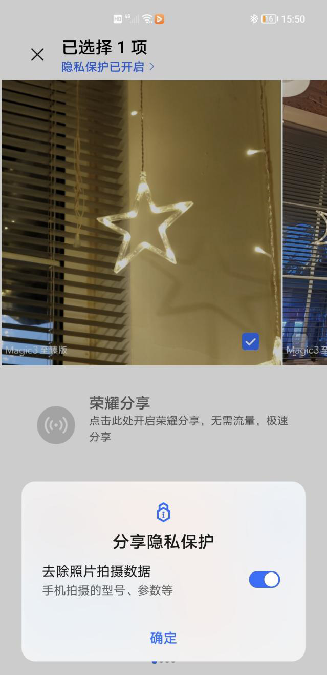在场景化隐私保护方面,Magic UI 5.0 带来了“照片分享脱敏”功能,在分享图片前点击“分享隐私保护“即可选择“去除照片拍摄数据”或“去除照片位置信息”;