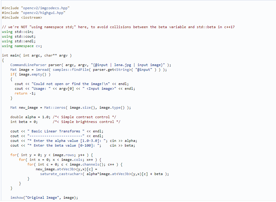 下面的代码执行g(i,j)=α⋅f(i,j)+β操作