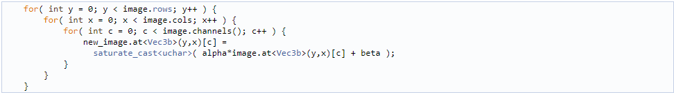为了执行g(i,j)=α⋅f(i,j)+β操作,我们必须访问图像的每个像素。由于是对BGR图像进行操作,所以每个像素包含(B,G和R)三个值,我们必须分别访问它们。具体代码如下: