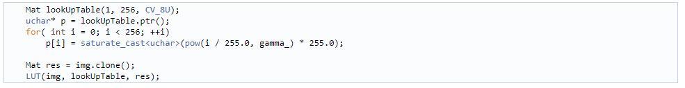 我们利用 image.at 由于α⋅p(i,j)+β 操作的值可能溢出或为非整数(如α是浮点数),我们用CV :: saturate_cast来确保该值的有效性; 最后,我们用以下方式创建窗口并显示图像。 注 我们利用以下简单的命令来取代for循环来访问图像的每个像素: cv::Mat::convertTo将执行*new_image = a*image + beta*操作.。但是,我们想向你展示如何访问每个像素。在任何情况下,这两种方法都给出相同的结果,但 convertTo 更加优化并且工作速度更快。 我们不运行代码,设置α = 2.2和β = 50。 在本小节中,我们将以前学到的技巧付诸实战,通过调整图像的亮度和对比度来校正曝光不足的图片。同时,学习利用伽玛校正(gamma correction)技术来校正图像的亮度。 增大(或减小) β值将加大(/减小)各个像素的对比度。像素值超出 [0; 255]范围之外的值将会饱和(即:大于255,或小于0的像素值将钳位到255或 0)。 原始图像的浅灰色直方图中,深灰色亮度= 80 GIMP 直方图表示该色彩像素中每种色彩的数目。深色图像的像素值将大于浅色图像的像素值,因此直方图的左半部分会出现一个峰值。当添加一个恒定的偏差之后,整个直方图右移,为所有的像素增加了一个恒定的偏置。 修改参数α将修改水平轴的展幅,如果α <1中,色彩值将被压缩,其结果是图像的对比度降低。 原图像的浅灰色直方图中,深灰色时, 对比度GIMP <0 注意,利用对比度/亮度工具Gimp获得的上述柱状图,亮度工具的偏置参数β应该与之相同,但对比度工具的增益参数α是不同的(可以从前面的直方图中看出)。 调整偏置参数β可以提高亮度,但同时,图像的对比度会下降,图像上似乎会蒙上一层轻微的面纱。调整增益α增益可缓释这种效果,但是由于出现饱和,图像将失去原有明亮区域的一些细节。 伽瑪校正利用输入值和输出映射值之间的非线性变换,校正图像的亮度: 由于这种关系是非线性的,其效果不会影响所有的像素,最终输出将取决于像素的原始值。 打印出不同的伽玛值(gamma) 当γ <1时,,原始图像的暗区将变得更加明亮,整个直方图将右移;当γ & 1时, 原始图像的亮区将变得更暗,整个直方图将左移。 我们设置α = 1.3和β = 40修正下面的图像。 图: Visem的作品 [CC BY-SA 3.0],来源:维基共享资源 图像的整体亮度得到了改善,但可以看出: 由于色彩的像素数值饱和,图中云彩已经饱和(摄影高光修剪)。 我们用γ=0.4修正下面的图像。 图: Visem的作品 [CC BY-SA 3.0],来源:维基共享资源 由于映射是非线性的,伽马校正添加了少量的饱和效应,并且不存在前面所述方法的数值饱问题。 左边:α,β校正后的直方图;中间:原始图像的直方图;右边:伽马校正后的直方图 上图比较了三幅图像(三个直方图的y值不相同)的直方图。从中可以发现,大部分的像素值都在原始图像直方图的下部。α , β修正后,由于图像出现饱和,在255 处可以观察到一个峰值,整个直方图右移。伽玛校正后,直方图右移,图像暗区域中的像素移动的位移比在明亮区域像素移动的位移更大(见伽玛曲线图)。 在本教程中,描述了两种调整图像对比度和亮度简单的方法。它们只是基本技术,不能用作光栅图形编辑器的替代品! 教程的源代码请访问原文(地址在文末) 伽马校正的源代码Code: 在这里,由于一次只需要计算256 个数值,利用查找表来提高计算性能。 图形渲染中的伽玛校正 CRT监视器的伽玛校正和图像显示 数字曝光技术 注:本文以C++语言代码为例,获取Java和python版本可在原文中查看: https://docs.opencv.org/4.5.2/d3/dc1/tutorial_basic_linear_transform.html 编辑:于腾凯