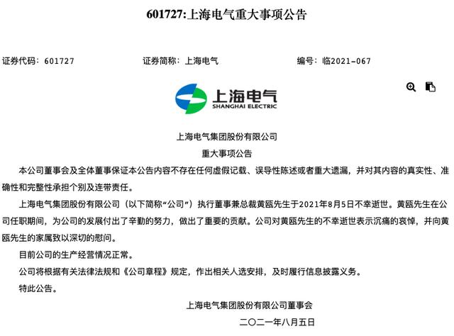 近期处于舆论漩涡之中的上海电气(601727)又有突发事件。公司8月5日晚间公告,执行董事兼总裁黄瓯于2021年8月5日不幸逝世。上海电气表示,黄瓯在公司任职期间,为公司的发展付出了辛勤的努力,做出了重要的贡献。上海电气对黄瓯的不幸逝世表示沉痛的哀悼,并向黄瓯的家属致以深切的慰问。