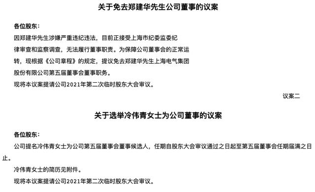 同时在8月6日上海电气公布2021年第二次临时股东大会会议公告称提议免去郑建华先生上海电气集团股份有限公司第五届董事会董事职务;提名冷伟青女士为公司第五届董事会董事候选人,任期自股东大会审议通过之日起至第五届董事会任期届满之日止。