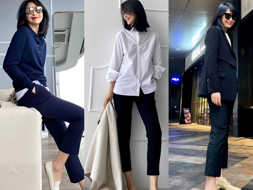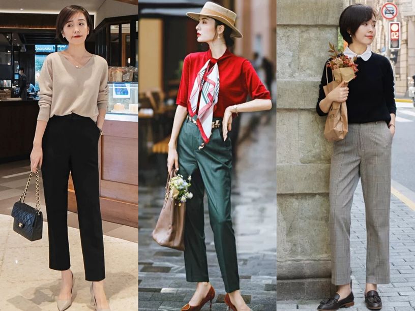 白色衬衫搭配黑色烟管裤,经典的职场通勤风,简洁知性的气质,明快利落感很强,上班穿最适合。藏青色针织衫搭配同色烟管裤,非常显高级的搭配,营造出随性大气的氛围,不分场合,都可以穿。