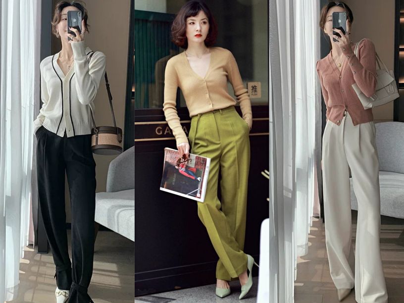 黑色针织开衫搭配白色棉T与灰色格纹烟管裤,经典的中性色搭配,特别适合上班穿,优雅知性中带着随性自然的范儿。淡雅温柔的樱花粉针织开衫,搭配白色棉T与卡其色阔腿裤,很精致的女人味,非常适合中年女性,减龄又很有质感。