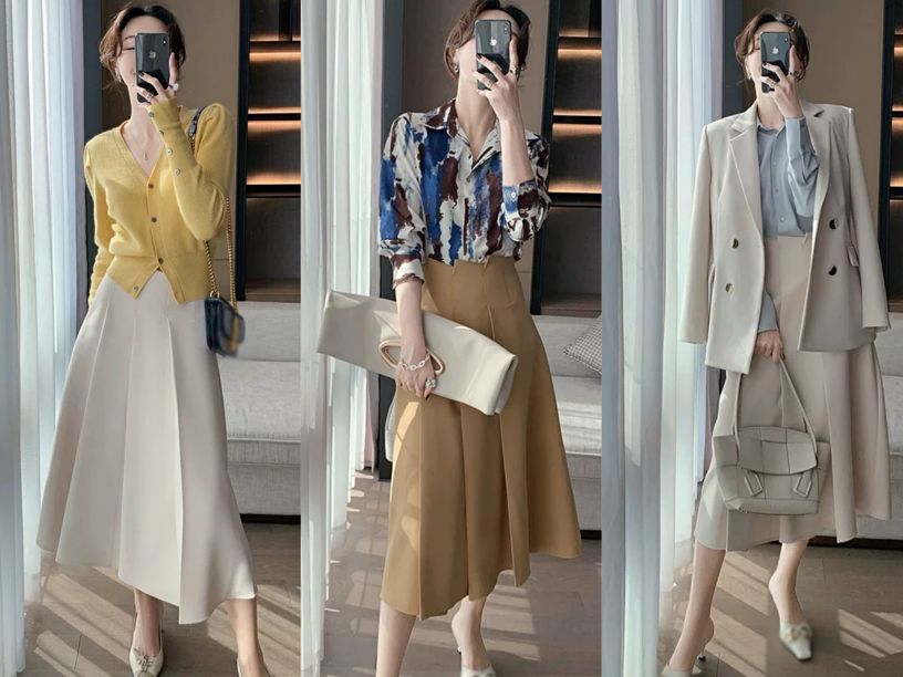 蓝色印花衬衫搭配驼色赫本褶裙,宽褶的赫本百褶裙有收腰的设计,显瘦又得体大气,配色也很时髦,很优雅的法式风格。黄色针织衫搭配白色赫本百褶裙,简约、温柔不失时髦感,都市OL风,非常适合成熟一点的女生,减龄效果超好。
